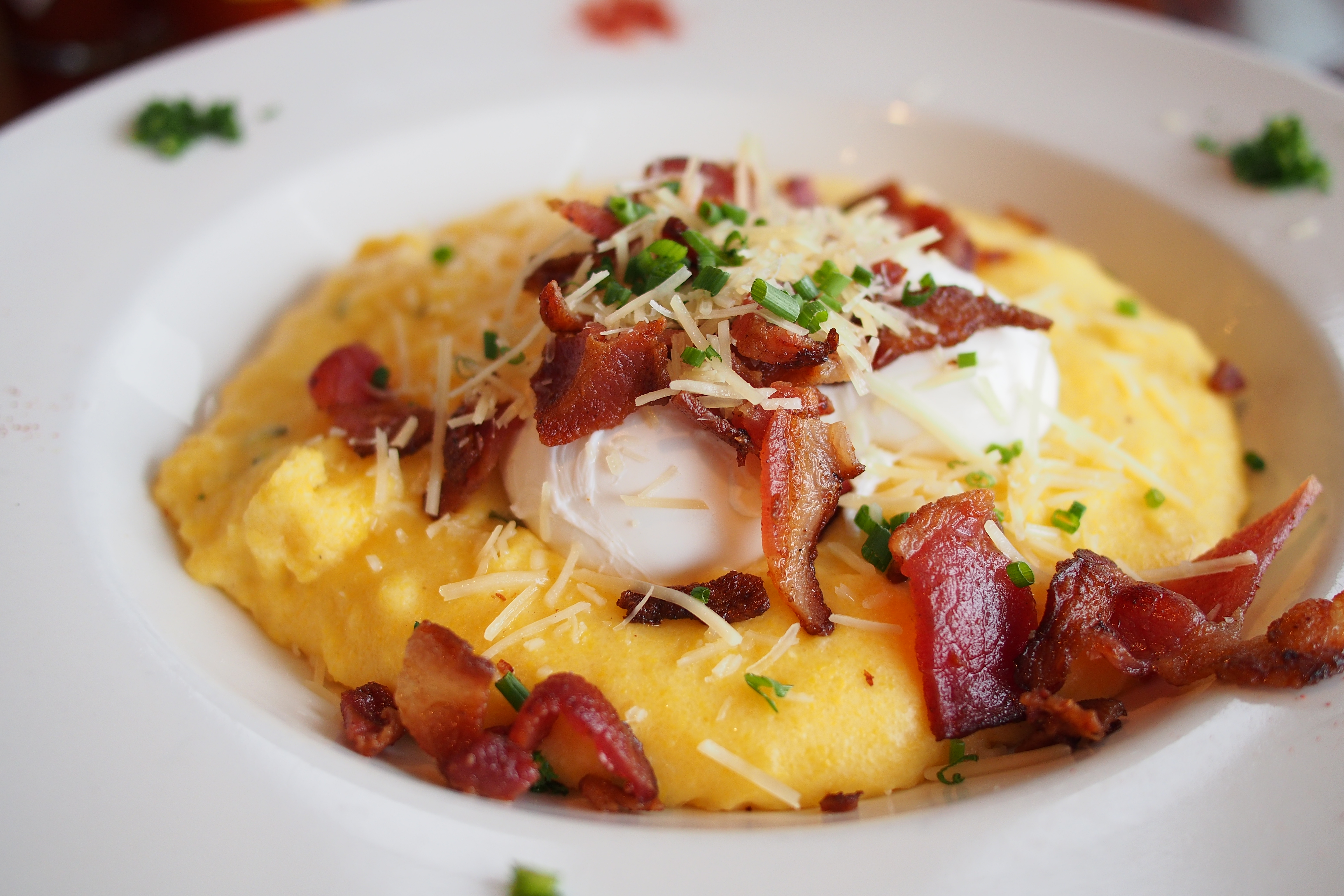 Polenta with poached eggs and bacon